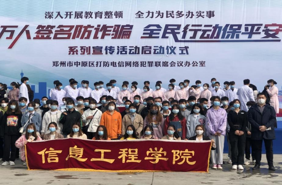 近年来,校园电信网络诈骗案件屡屡发生,大学生成为了诈骗的目标群体。为切实防范校园电信网络诈骗,积极开展反诈宣传教育。3月27日上午,信息工程学院组织师生共46人在奥体中心广场参与由中原区人民政府主办,中原公安分局承办的“万人签名防诈骗,全民行动保平安”系列宣传防范活动。