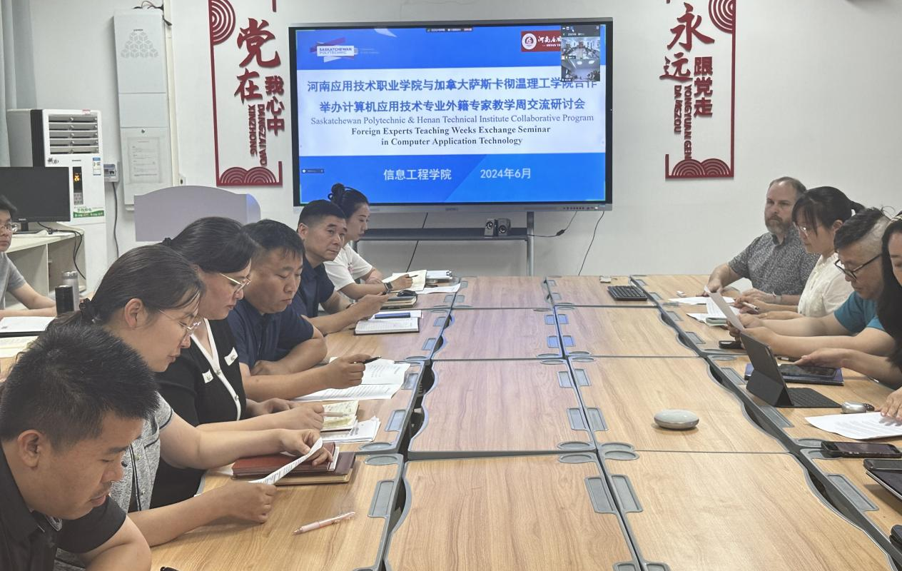 6月4日下午,信息工程学院在行政楼517会议室召开“加拿大萨斯喀彻温理工学院计算机应用技术专业中加合作办学项目中外教师交流研讨会”。中加国际合作项目主任、项目管理委员会委员Grace Liu 、项目管理专员Bruce Yu、加方专家Jason Schmidt、 Alex Wang, 信息工程学院专兼职教师参加会议。会议由夏丽珍副院长主持。