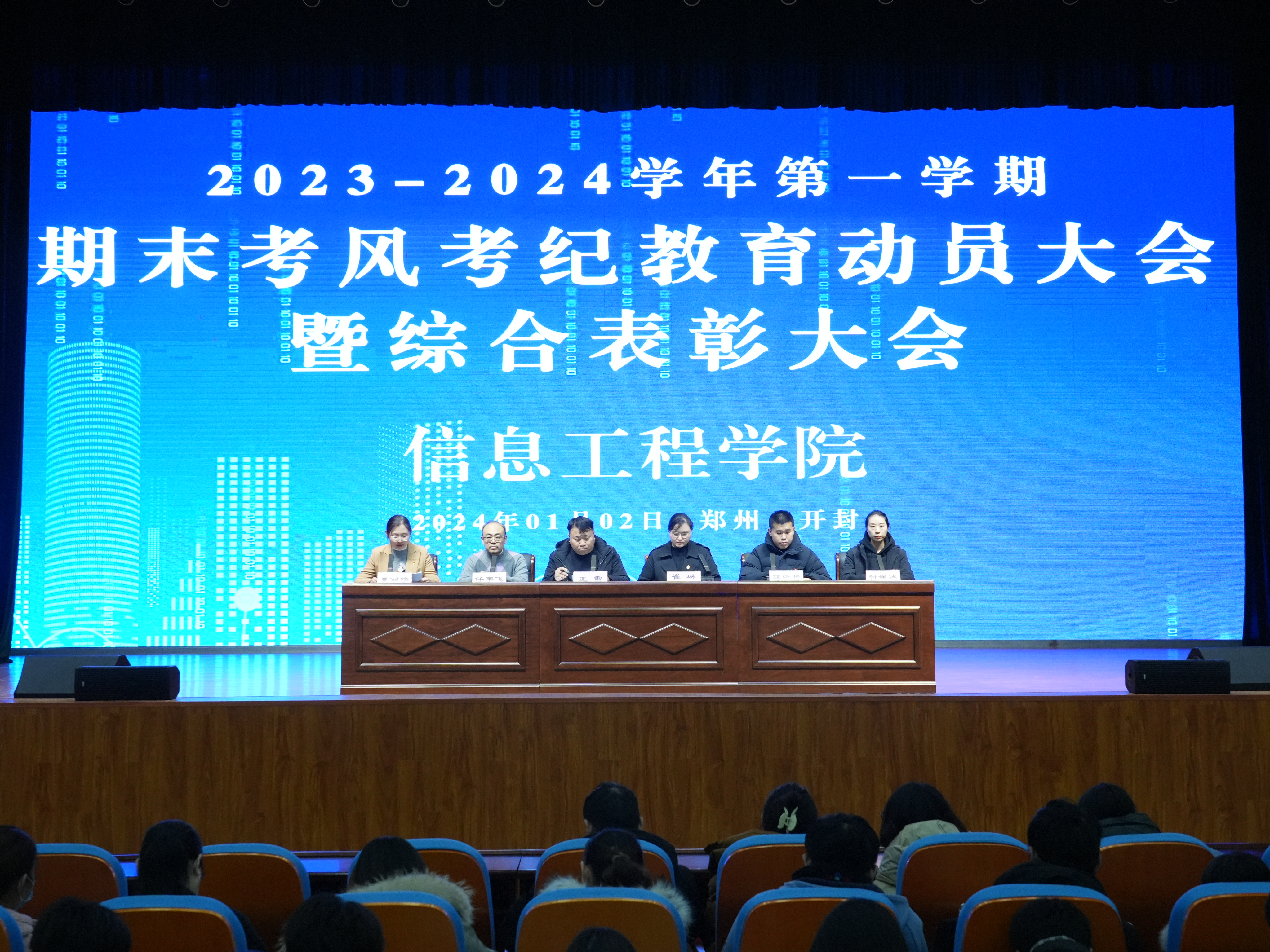 为进一步响应九游体育关于考风考纪的号召,加强考风、班风、学风的建设,让全院学子以良好的心态、最佳的状态迎接期末考试,2024年1月2日下午,我院在郑州校区学生活动中心、开封校区教学楼A102同步召开信息工程学院2023-2024学年第一学期期末考风考纪教育动员大会暨综合表彰大会。信息工程学院院长王雷、党总支书记崔琳、副院长齐峰、副院长夏丽珍、党总支副书记蒋欣哲、党政办主任付媛冰、学工办主任常昆、团总支书记冷月、全体专兼职辅导员、教师代表和学院各班级学生代表参加了此次会议。会议由夏丽珍主持。