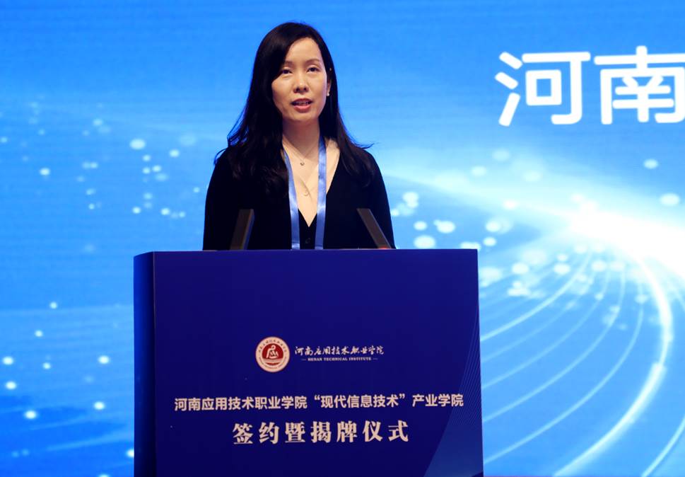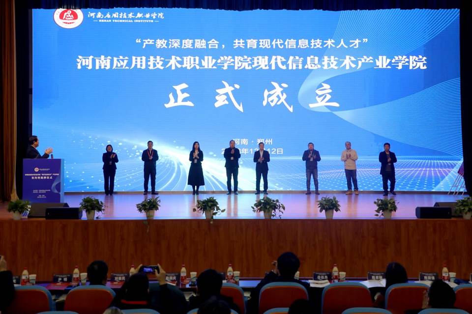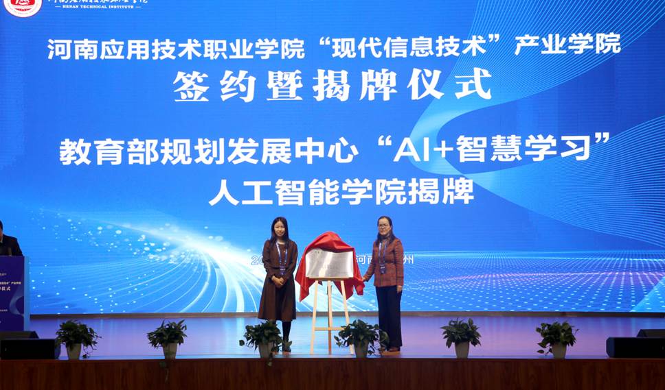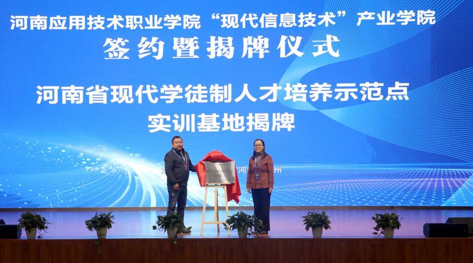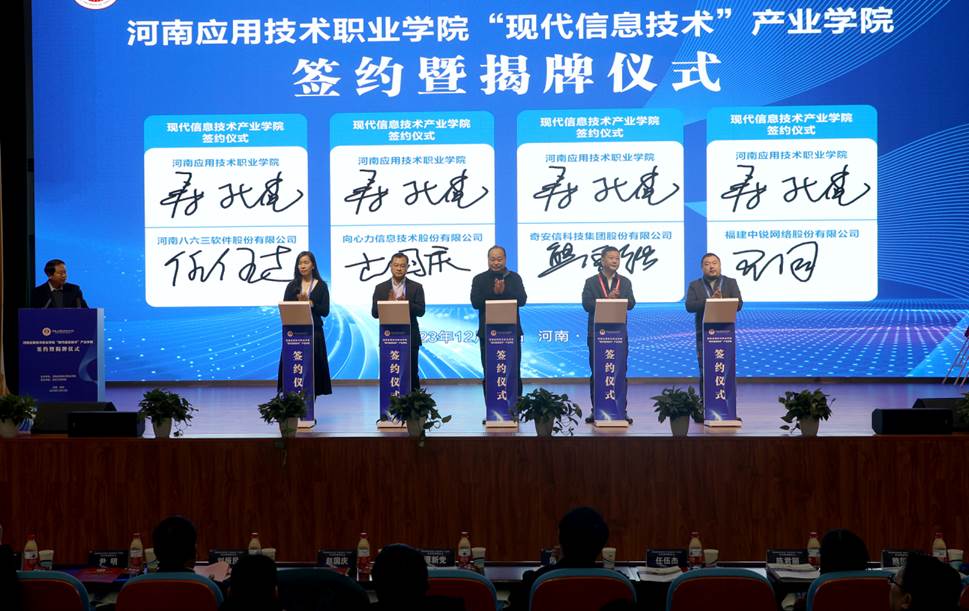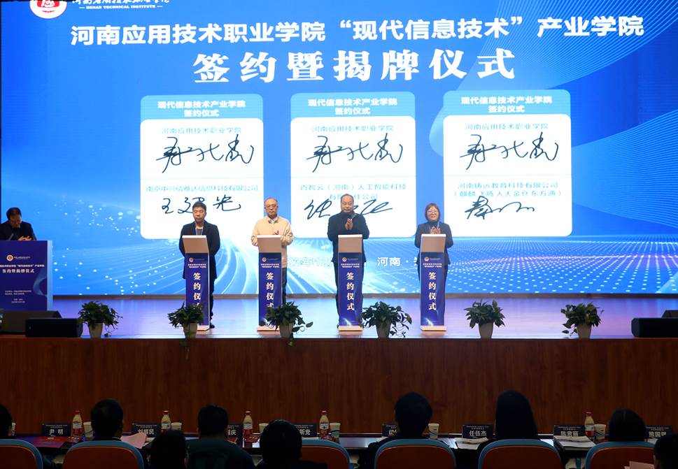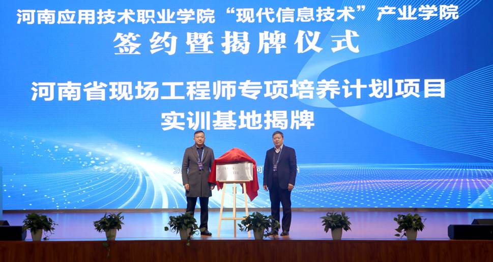 副校长陈君丽、刘振民和企业联盟领导代表为“教育部规划发展中心AI+智慧学习人工智能学院”、 “河南省现代学徒制人才培养示范点实训基地”、“河南省现场工程师专项培养计划项目实训基地”三个重点项目揭牌,正式揭开“现代信息技术产业学院发展三年规划”的序幕。