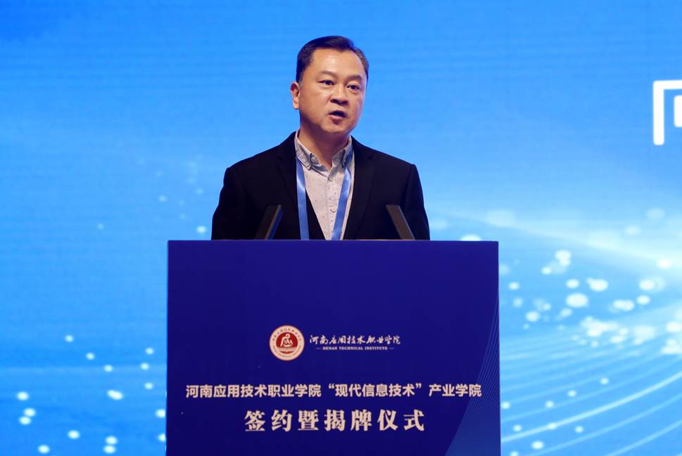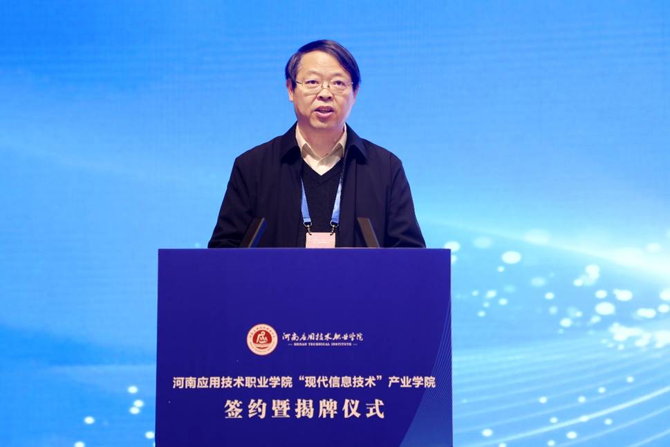 党委书记闫俊山代表学校致辞。他首先对各位来宾表示热烈欢迎,向关心、支持产业学院创建的各界朋友表示衷心的感谢。他强调校企共建“现代信息技术产业学院”,是校企各方相互认可、优势互补、不懈努力的结果,顺应了国家、行业以及学校的发展战略,是时代所需、产业所需、学校所需、学生所需。对于九游体育推进内涵建设,实现“十四五”目标、争创国家级双高校、举办职业本科教育都具有十分重要的意义,也必将产生深远的影响。他希望“现代信息技术产业学院”成为融学科建设、人才培养、应用研究、创新创业等功能于一体的示范性育人平台和服务地方电子信息产业的主阵地,为锚定“两个确保”、实现“十大战略”,奋力推进中国式现代化建设河南实践作出新的更大贡献!