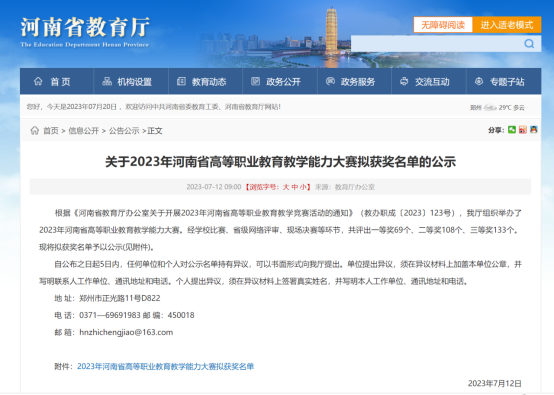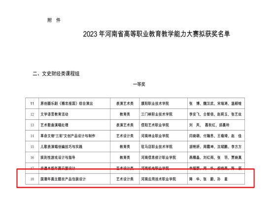 近日,河南省教育厅公示了2023年河南省高等职业教育教学能力大赛获奖名单,信息工程学院教师团队(降华 张蔚 孙星)的参赛作品《国潮年画主题农产品包装设计》荣获艺术设计类课程组一等奖。这是我院获得的又一个教师技能比武省级荣誉,实现了我院及九游体育在全省职业院校教学能力大赛艺术设计类课程组的新突破。