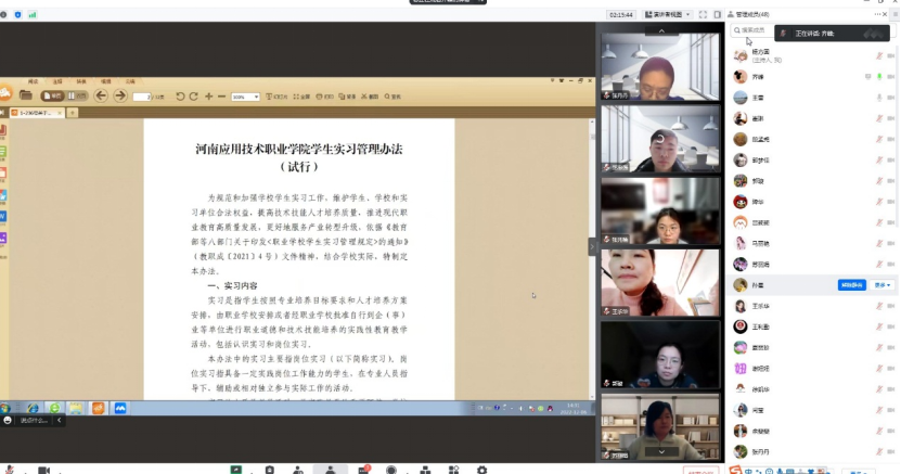 2022年12月6日下午,信息工程学院全体行政人员、辅导员及专兼职教师按照教务处安排,通过腾讯会议由主管顶岗实习的齐峰副院长领学了“河南应用技术职业学院学生实习管理办法(试行)”、“河南省教育厅办公室关于做好2022-2023年职业院校学生实习有关工作的通知”和“全省职业学校开展违规组织学生实习问题追责问责案例以案促改工作方案”三个文件。