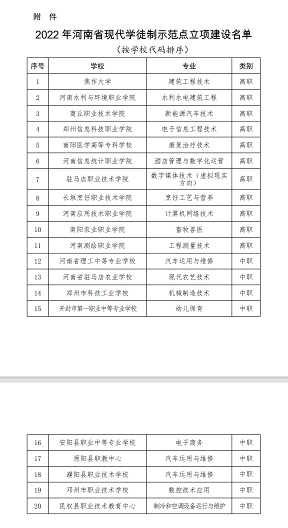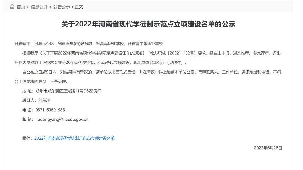 6月28日,河南省教育厅发布《关于2022年河南省现代学徒制示范点立项建设名单公示》,信息工程学院计算机网络技术专业被认定为河南省第二批现代学徒制示范点拟立项建设项目。