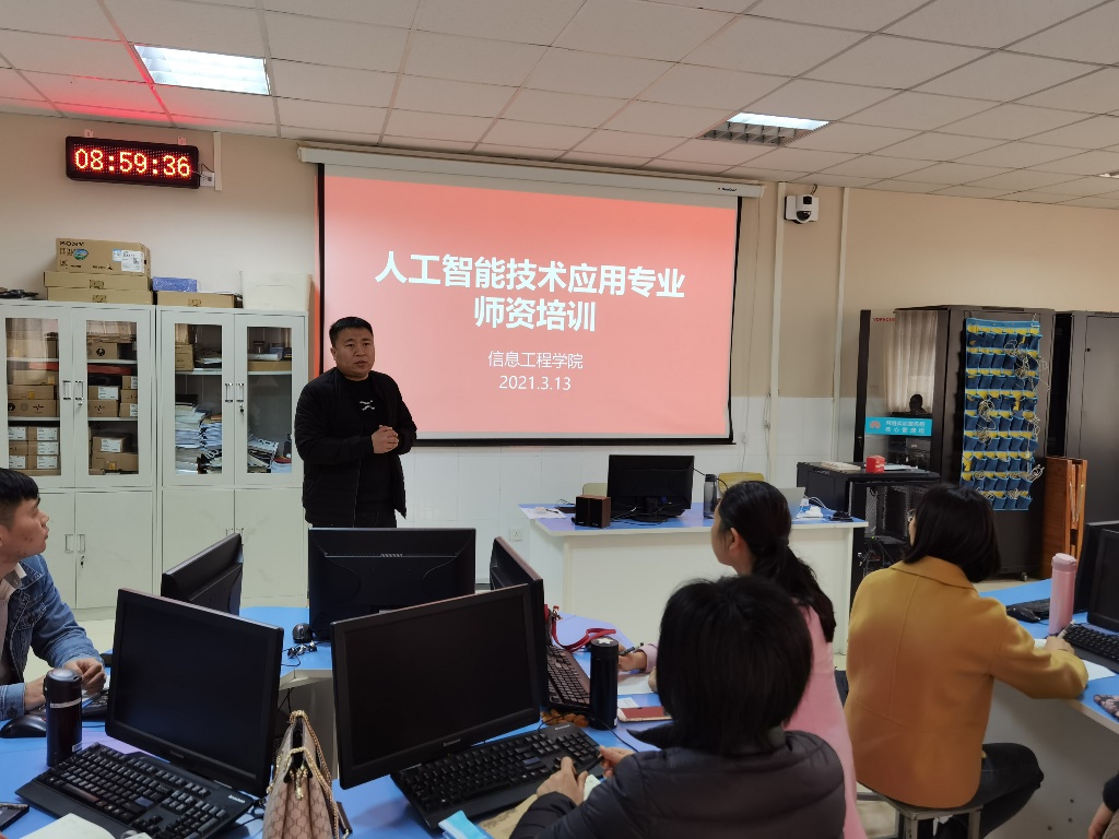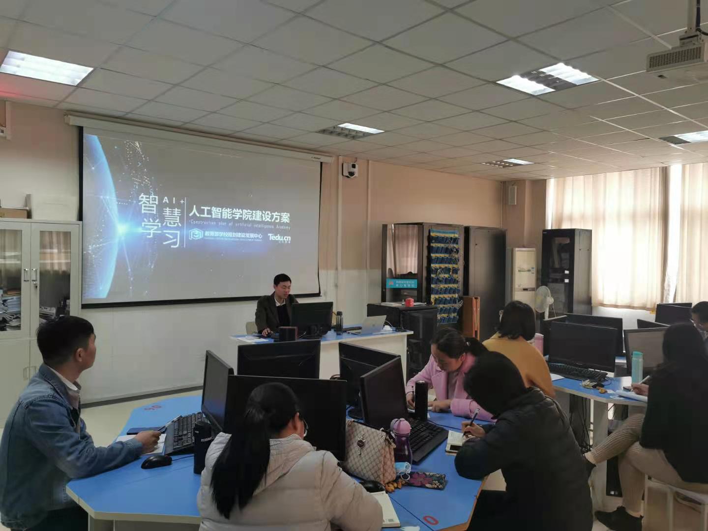 为提升人工智能技术应用专业教学团队师资水平,促进人工智能实训室建设, 2022年3月13日达内科技集团对信息工程学院计算机应用教研室部分专业骨干教师进行为期一天的专业建设及实训基地设备和平台培训。