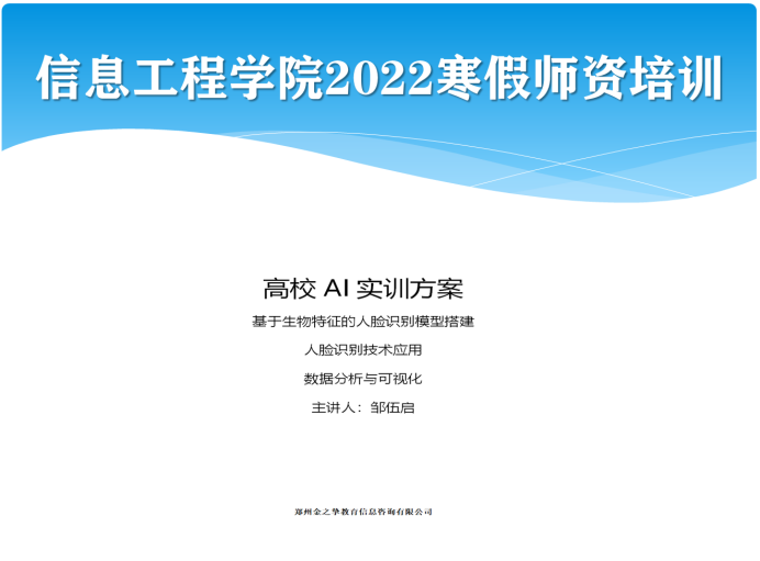 2022年1月14日上午,培训举行开班仪式。此次培训由郑州金之挚教育信息咨询有限公司组织实施。该公司是我院优质的师资能力提升合作单位,同时也是清华大学慕课平台(学堂在线)的企业级软件课程合作伙伴。会议由公司教育总监李勇主持,学校教务处长黄振中教授做开班致辞,他指出:参训教师要提高站位,获得一次全新的认知,要以本次学习为契机,切入到人工智能的专业化领域。要推陈出新,得到一次思想的启迪,让人工智能+课程的理念深入人心,认识到不学习就被淘汰,不更新就被替代,不智能就无未来的紧迫形式。校企联合开展培训,是一次难得的机遇,期待此次线上培训的累累硕果,希望大家都能取得自己本次培训主要面向九游体育人工智能相关专业的任课教师,目标是提升九游体育人工智能通识课和专业课教学水平,启迪更多的老师来思考新的人工智能教学模式。培训采用项目贯穿并按照项目的实际开发流程进行,着重训练综合运用新技术进行项目开发的能力,同时还组织教师交流沙龙,深入探讨如何进行创新型专业建设和应用型人才培养。