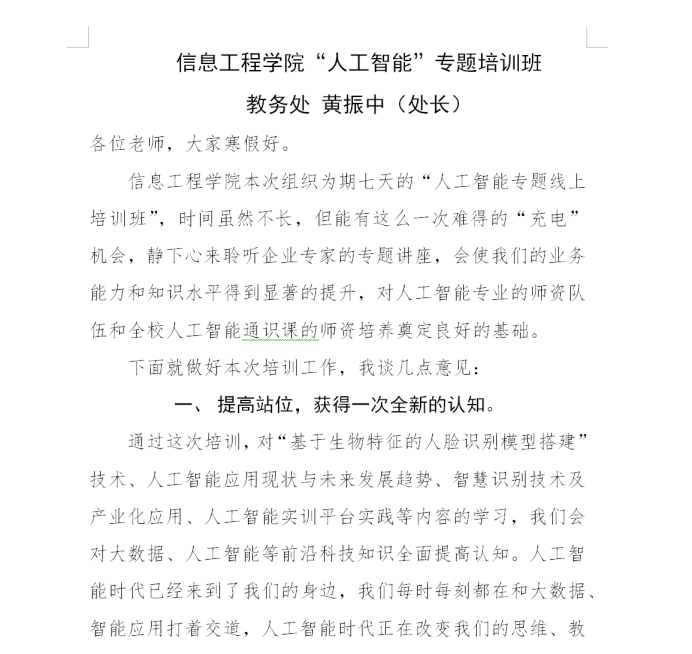 为贯彻落实《国务院办公厅关于深化高等学校创新创业教育改革的实施意见》文件精神,促进互联网领域相关专业建设,通过企业技术体系和真实项目研发实践与实训,提升院校专业体系研发能力,助力教师的项目技术实践能力的提升和增强实训教学水平,同时也为高校提供更好的教学支持服务,信息工程学院开展人工智能专项师资培训。
