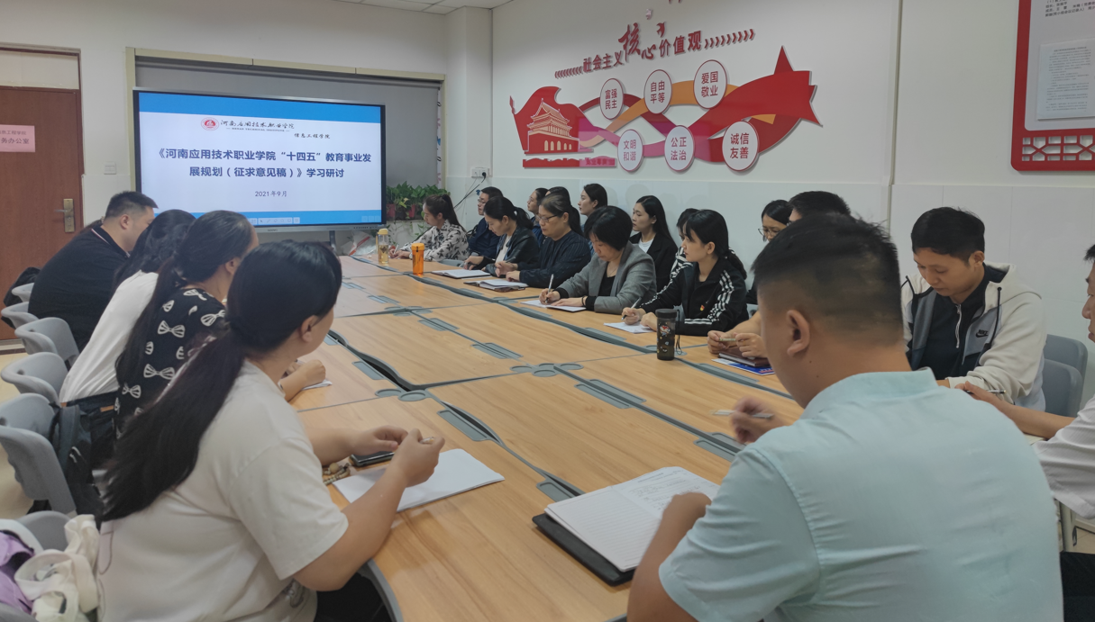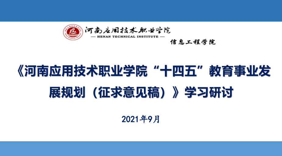 为加快推进教育现代化,提升人才培养质量,办好人民满意的教育,根据学校要求,信息工程学院组织全体教职工于2021年9月28日下午对《河南应用技术职业学院 “十四五”教育事业发展规划 (征求意见稿)》进行了学习研讨。