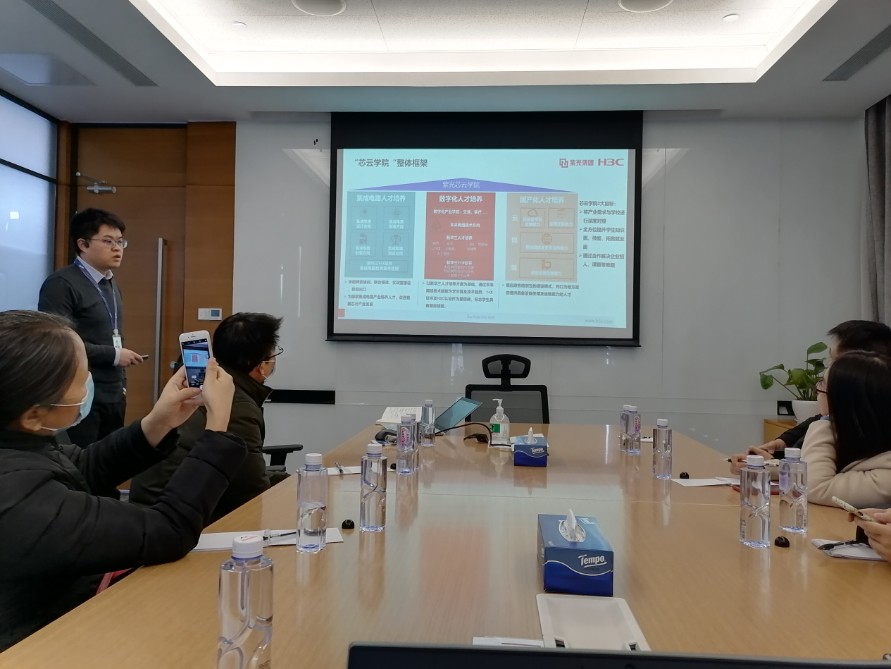 为提高人才培养质量,提升大数据技术、计算机网络技术等相关专业人才培养精准度,促进校企合作产教融合,01月28日上午信息工程学院院长王雷、计算机应用教研室主任吴华芹、网络通讯技术教研室主任郭璇及各专业负责人任立锋、张丹丹、谢妞妞等教师到新华三集团(以下简称H3C)大数据技术有限公司进行产教融合调研。
