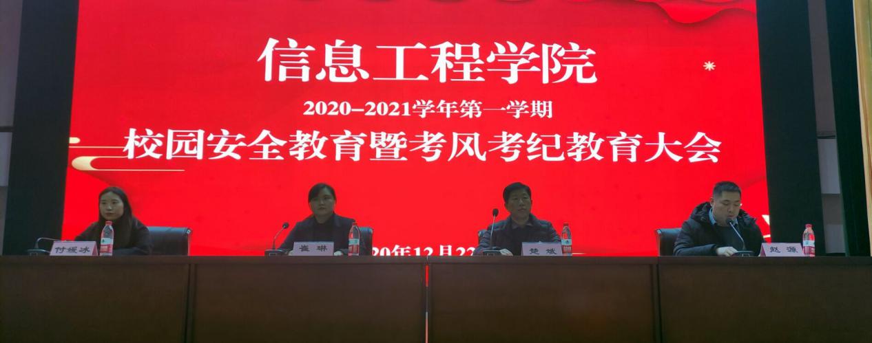 为强化同学们的校园安全意识,树立良好的考风、考纪,信息工程学院于2020年12月22日中午12:30,在学生活动中心召开“2020-2021学年第一学期校园安全教育暨考风考纪教育大会”。信息工程学院书记楚斌、副院长崔琳,教工办主任付媛冰,团总支书记赵源,各年级辅导员及各专业教研室主任和专业负责人参加会议,会议由赵源主持。