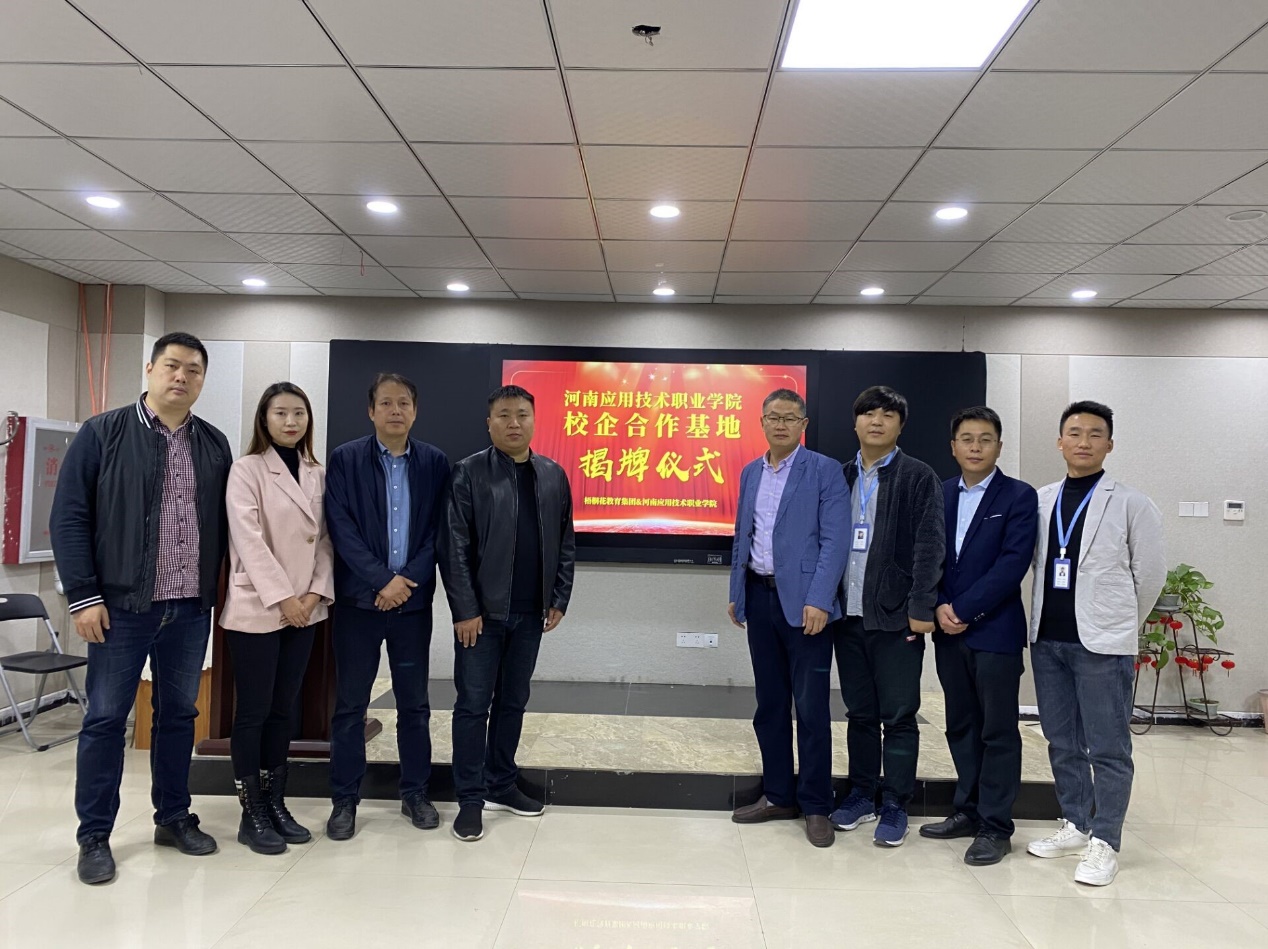 2020年11月9日,河南梧桐花科技有限公司与河南应用技术职业学院校企合作基地揭牌仪式在河南梧桐花科技有限公司隆重举行。河南应用技术职业学院信息工程学院院长王雷、河南应用技术职业学院教务处副处长王勇、河南应用技术职业学院信息工程学院团总支书记赵源、河南应用技术职业学院信息工程学院教工办主任付媛冰、河南梧桐花教育集团董事长周晓东、河南梧桐花科技有限公司校企合作中心主任郭亚迪等人参加仪式。