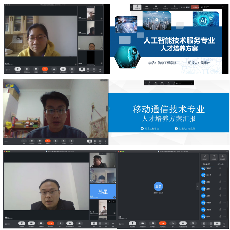 信息工程学院于2020年3月31日下午召开人才培养方案制定工作网络会议,会议的主题为人工智能技术与服务、移动通信技术专业两个新专业人才培养方案的制定,此次参会的领导和老师有教务处黄振中处长、王勇处长、信息工程学院王雷院长、崔琳院长以及信息工程学院东西校区全体专兼职教师。