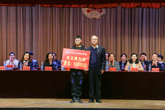 在现场,学校领导宣读了相关表彰决定和颁奖词,1143名学生获得校级奖学金、314名学生获得国家励志奖学金、12名学生获得国家奖学金、3名学生获得39800元特等奖学金、在地铁救人的见义勇为模范余涛宏同学获得59800元微留学奖学金,与会领导为获奖学生进行了颁奖。