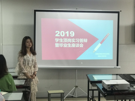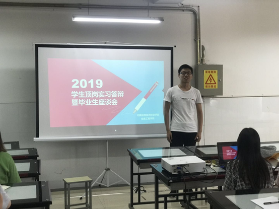 2019年6月10日上午,信息工程学院16级毕业生在E403进行了顶岗实习答辩暨毕业生座谈会。王雷院长和杨明杰书记参加了会议,会上网络专业的安海伟、计算机专业的万超和视传专业的徐辉等同学代表16级毕业生进行了现场答辩,顶岗实习指导教师张振平老师、王碧琳老师与学生进行了提问和交流。通过本次答辩和座谈会,学院获取了学生在顶岗实习期间的心得和感受,对信息工程学院的专业建设和顶岗实习管理工作提供了第一手的信息。