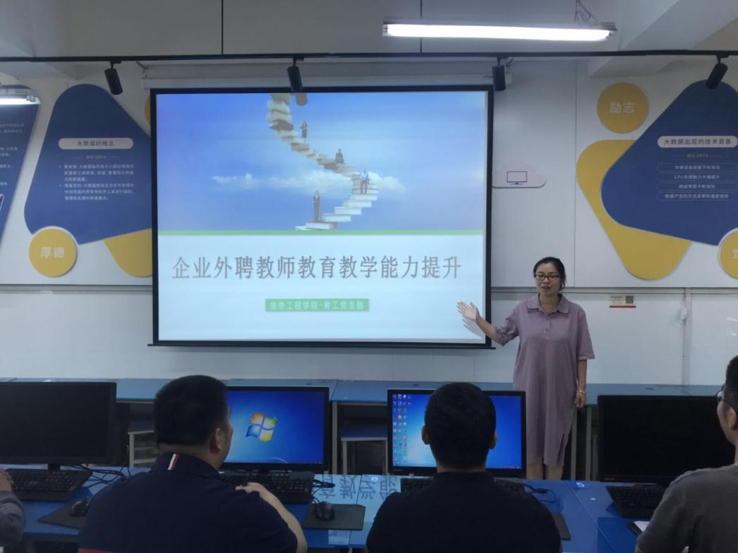 6月4日下午,信息工程学院教工党支部在E416举办了外聘教师教育教学能力提升培训会,参会人员为信息工程学院教工党支部全体成员及2018-2019学年第二学期承担我院教学任务的外聘教师,培训由院长王雷主持,郭璇老师进行汇报。