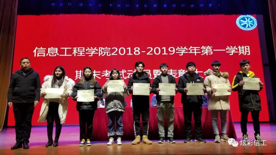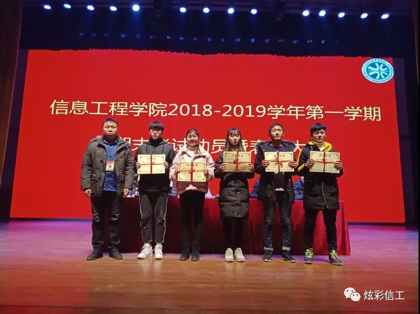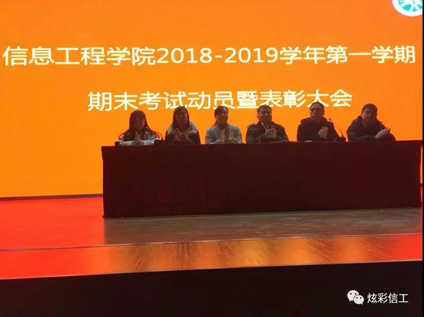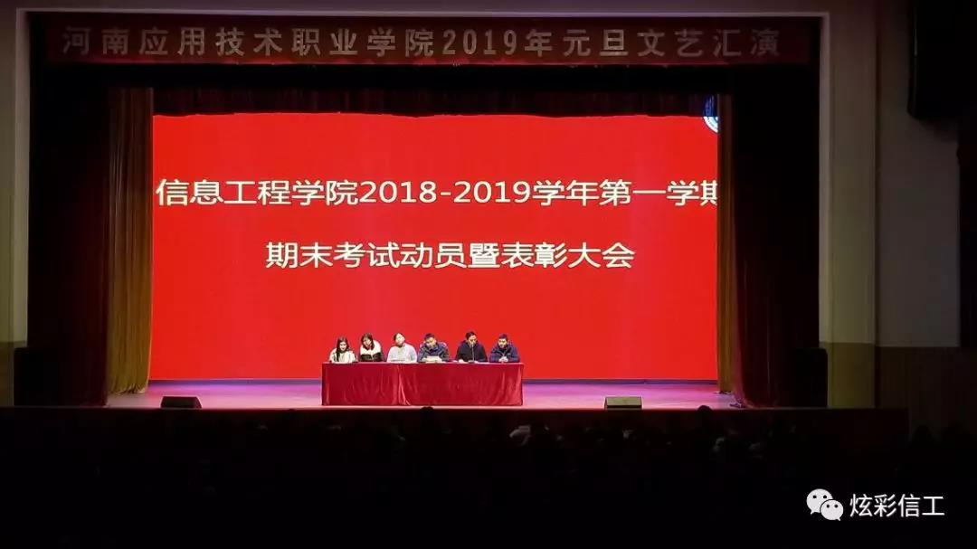 为加强学院学风建设,严肃考风考纪,确保教学质量,营造浓厚的学习氛围,树立典型,表彰先进,河南应用技术职业学院信息工程学院在2019年1月3日下午13:00在学校大礼堂召开了2018-2019学年第一学期期末考试动员暨表彰大会。出席本次大会人员有:信息工程学院院长王雷老师、副院长崔琳老师、党总支书记杨明杰老师、团总支书记王碧琳老师、计算机办公室主任马丽艳老师和计算机网络教研室主任张振平老师以及信息工程学院17,18级辅导员老师及信息工程学院17,18级同学。