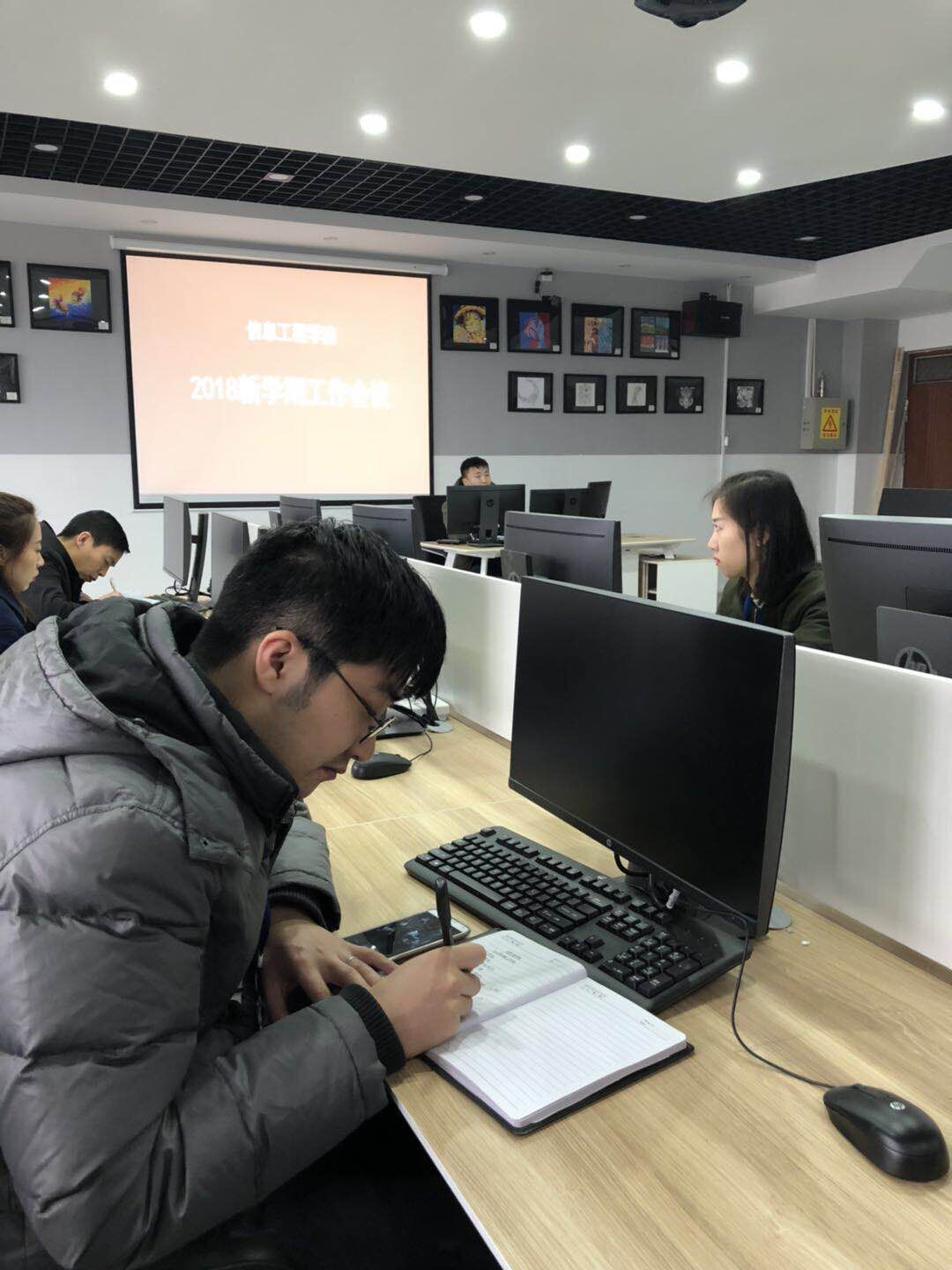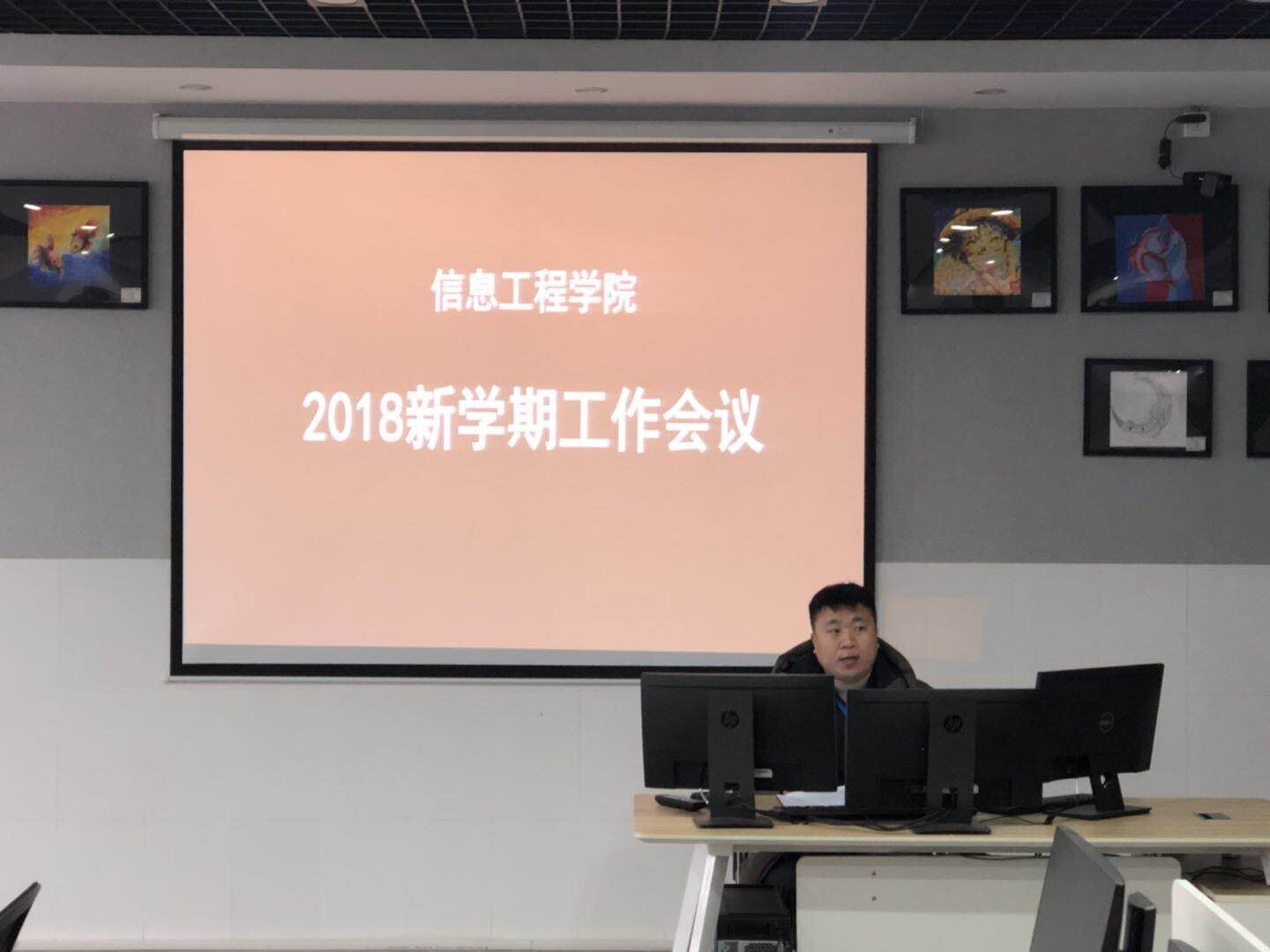 新学年新学期,新起点新征程,2018年3月1日,信息工程学院在E414实训室召开“新学期教学、行政运行管理工作会议”,会议就开学初的各项工作进行部署和安排。院长王雷就新学期教师授课、教与学模式改革、信息化技术应用、顶岗实习工作、毕业设计、人才培养方案修订等工作提出具体要求,并对新学期工作提出两点期望:一是树立不甘落后的进取意识,谋“新”求“变”。二是树立高质高效的“效率”意识,既要实干又要会干。崔琳副院长就实训室使用管理、课程调整安排进行部署。最后杨明杰书记对全年的党务管理、工会活动、党员活动等工作进行了动员。