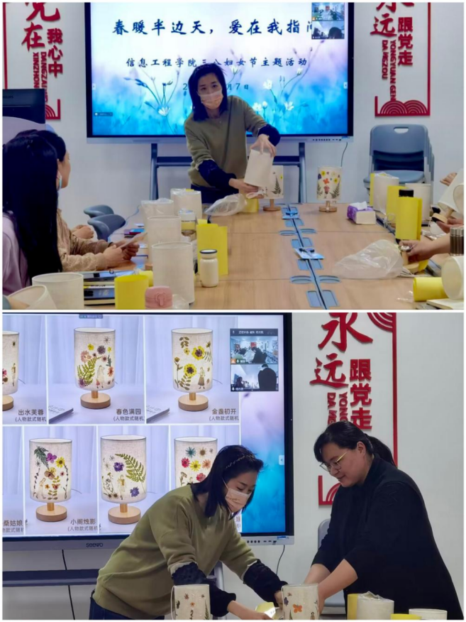 三月是春意与浪漫共存的日子,教师是点亮心灵的职业。为庆祝三八国际妇女节到来,更好地展现信息工程学院女教职工风采,同时关爱和答谢女教职工辛勤努力为信息工程学院做出的贡献,进一步激发工作热情和创造力,提升组织凝聚力,信息工程学院于3月7日下午分别在东、西校区同时开展“春暖半边天,爱在我指间”三八妇女节压花台灯DIY活动。