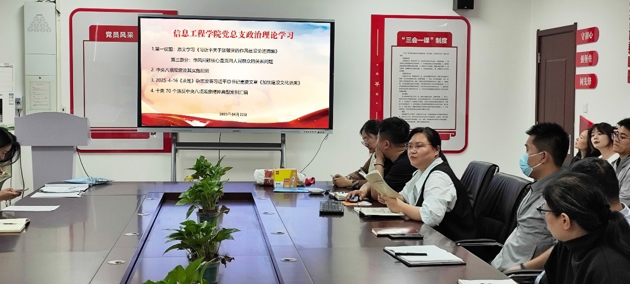 2025年4月22日,信息工程学院党总支组织郑州和开封校区全体党员及教职工,开展政治理论学习活动。本次学习活动由信息工程学院书记崔琳主持。主要学习内容有:1.第一议题:原文学习《习近平关于加强党的作风建设论述摘编》第三部分:作风问题核心是党同人民群众的关系问题 2. 中央八项规定及其实施细则 3. 2025-4-16《求是》杂志发表习近平总书记重要文章 《加快建设文化强国》 4. 十类70个违反中央八项规定精神典型案例汇编。