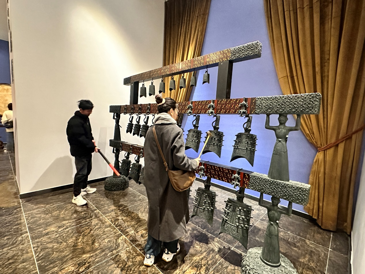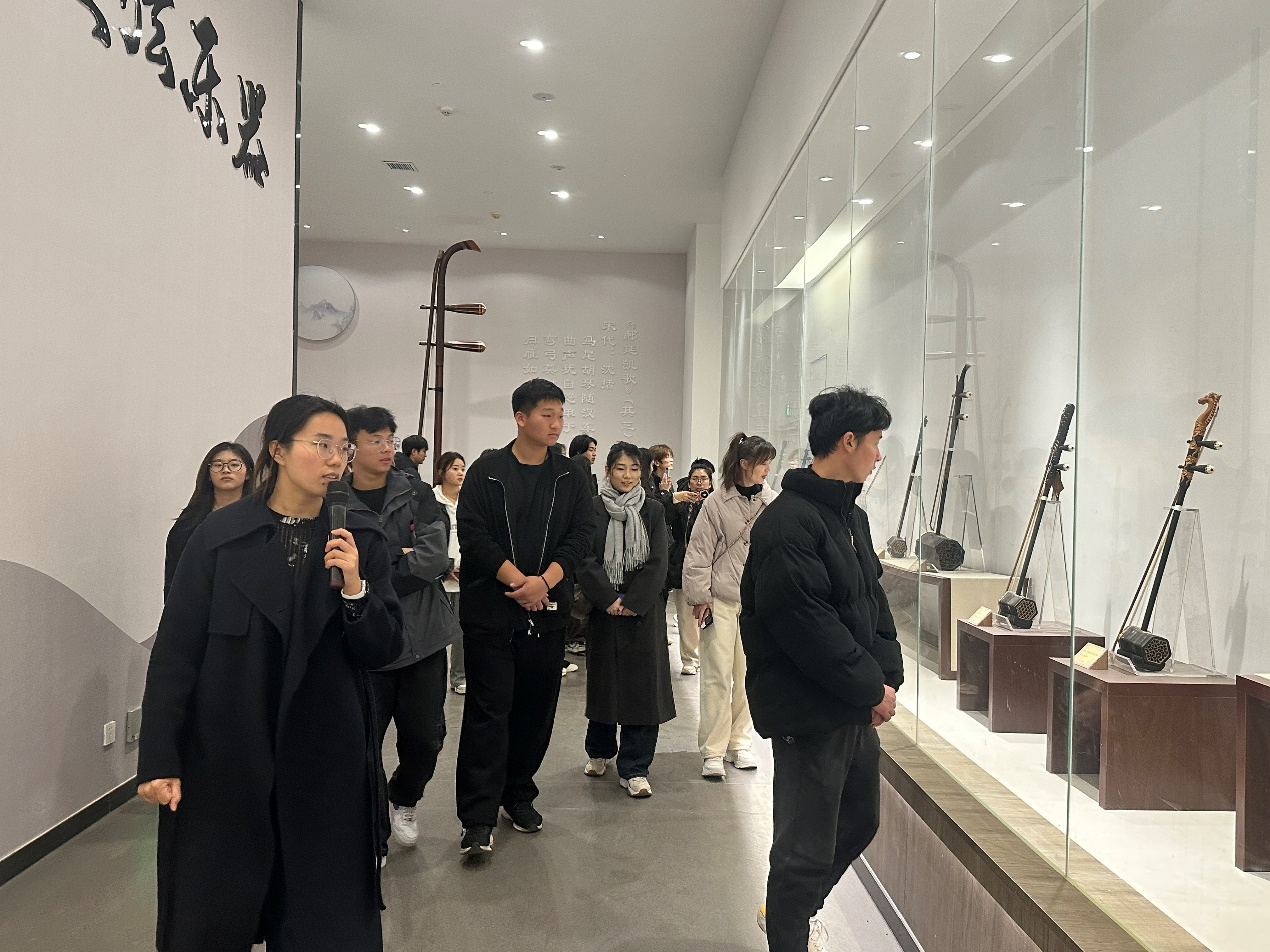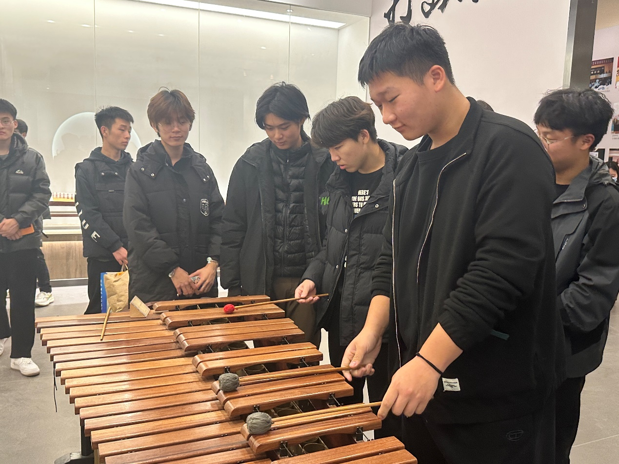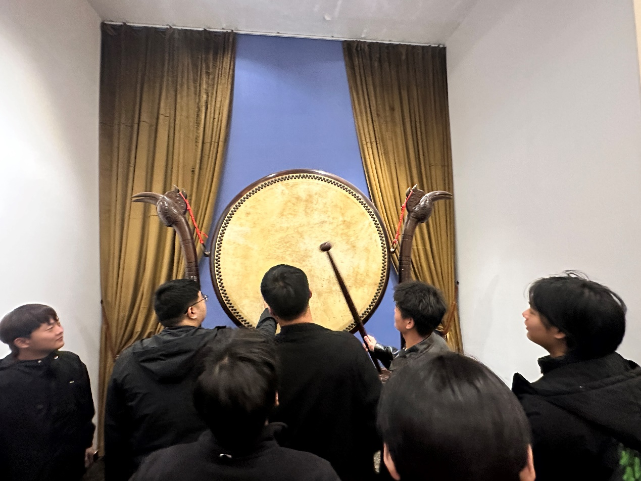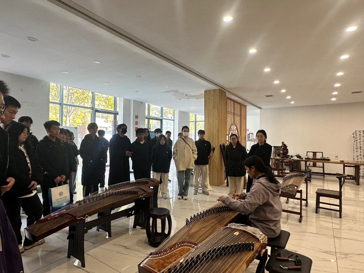 活动过程中,琴社负责人带领同学们到达多个斫琴展览室,并详细地向同学们介绍了多把琴的制作工艺流程。在不同展览室内,同学们也第一次有机会近距离接触古典乐器,了解其制作背景。当到达体验区时,更是按耐不住自己激动的心情,“击鼓、抚琴、敲磬”,沉浸式体验了一把文人雅士的志趣!为使同学们体验感更深刻,互动交流环节,基地老师更是亲自俯身,演奏琴曲。为同学们带来了一堂生动的古琴艺术鉴赏课,让学生“零距离”感受中华传统文化的别样魅力!