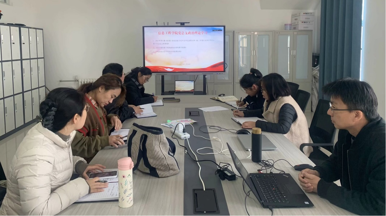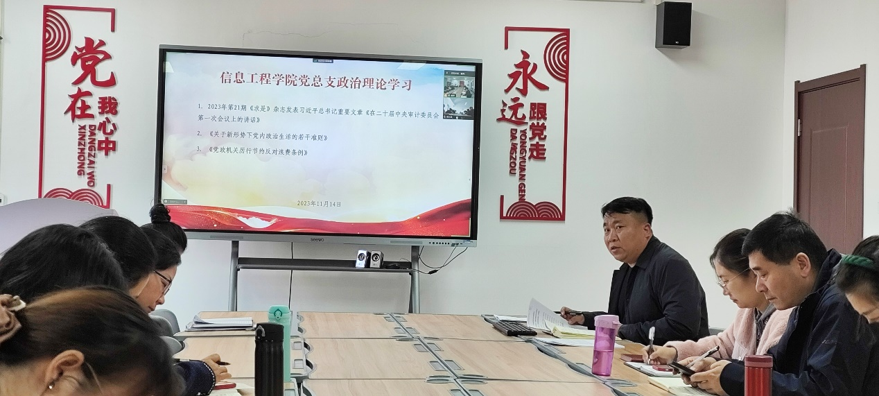2023年11月14日信息工程学院党总支组织全体党员及教师在郑州校区A514、开封北院C314开展政治理论学习活动,王雷院长主持会议。本次政治理论学习活动的内容包括:1.2023年第21期《求是》杂志发表习近平总书记重要文章《在二十届中央审计委员会第一次会议上的讲话》;2.《关于新形势下党内政治生活的若干准则》;3.《党政机关厉行节约反对浪费条例》。