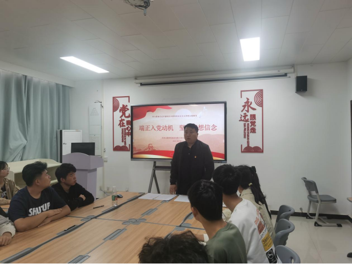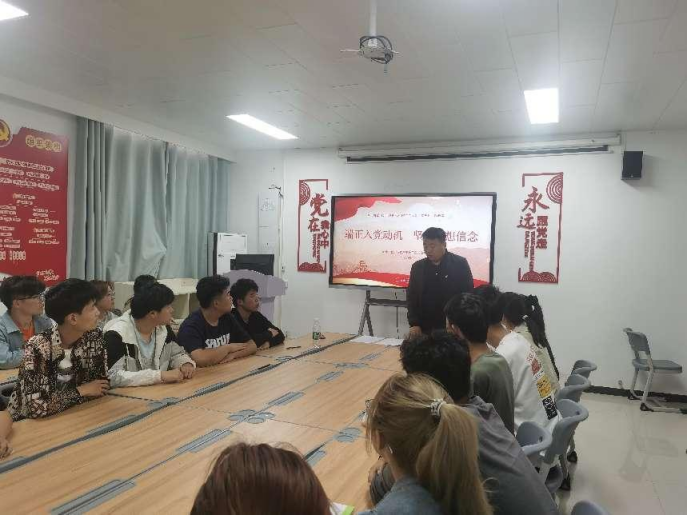 为学习贯彻习近平新时代中国特色社会主义思想及党的二十大精神,进一步加深广大师生对党的性质、纲领、任务、奋斗目标及党员权利和义务的认识与理解,端正入党动机,坚定理想信念,加强对我院师生的培训和教育,提高其思想政治素质和理论水平,信息工程学院党总支教工党支部于2023年5月8日,在郑州校区A514举行“端正入党动机 坚定理想信念”专题党课,教工党支部书记王雷为本次党课主讲人,2022级部分入党积极分子共50余人参加此次党课学习。