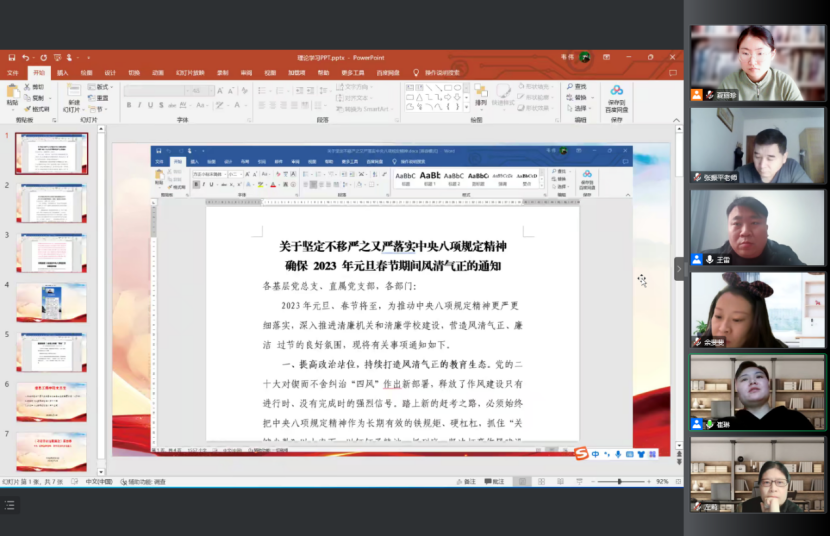 此次会议议程为两项,一是王雷传达学校教学工作会议精神及对寒假和下学期工作进行部署,二是崔琳总结党建工作完成情况,传达并组织学习学校纪委近期下发的三个重要文件。