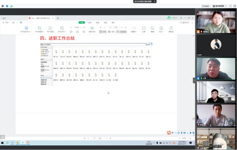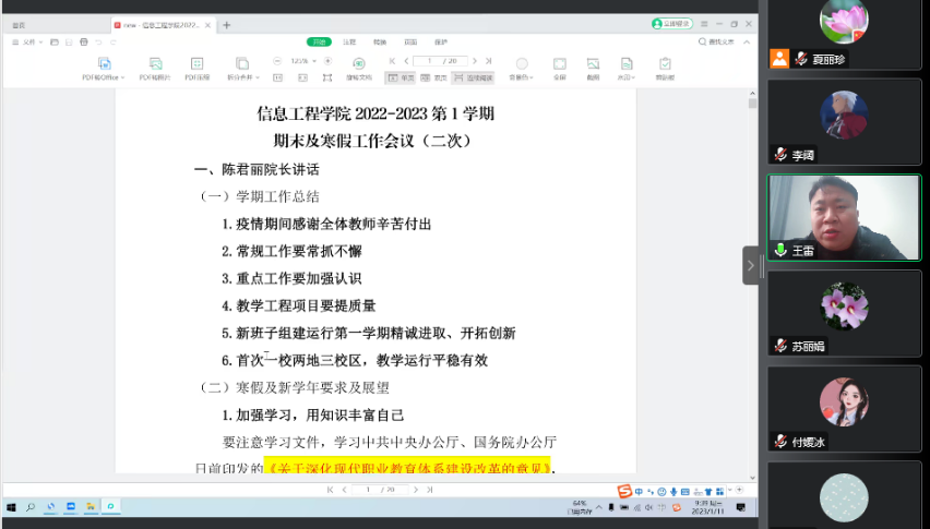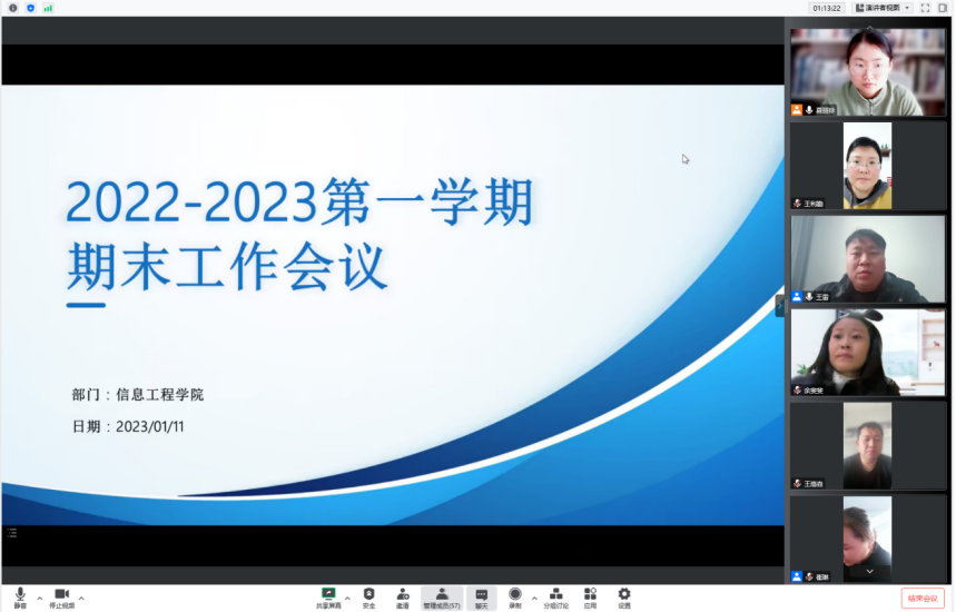 2023年1月11日上午9:30至11:30,信息工程学院通过腾讯会议召开了2022学年工作总结及新学年工作部署大会,会议由夏丽珍副院长主持,王雷院长和崔琳书记做整体工作部署,全体专兼职教师参会。