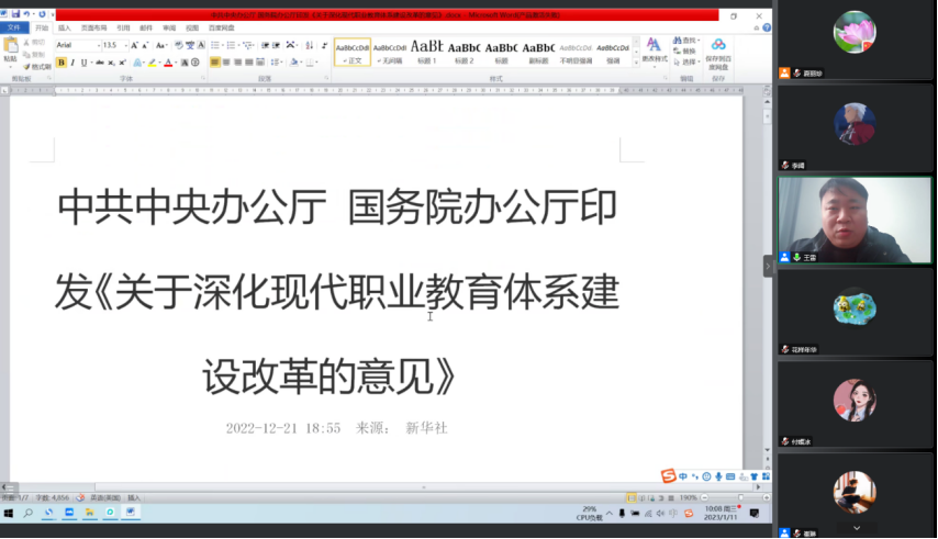 接下来,王雷传达教务处赵扬处长关于本学期重点工作及标志性成果的总结,梳理需要改进的工作,明确寒假和下学期重点工作,提出紧跟国家教育形势,重点在师德师风建设、双高建设、校企合作、产业融合、特色专业国际认证等方面下苦功夫,确保落实落地产出成果。