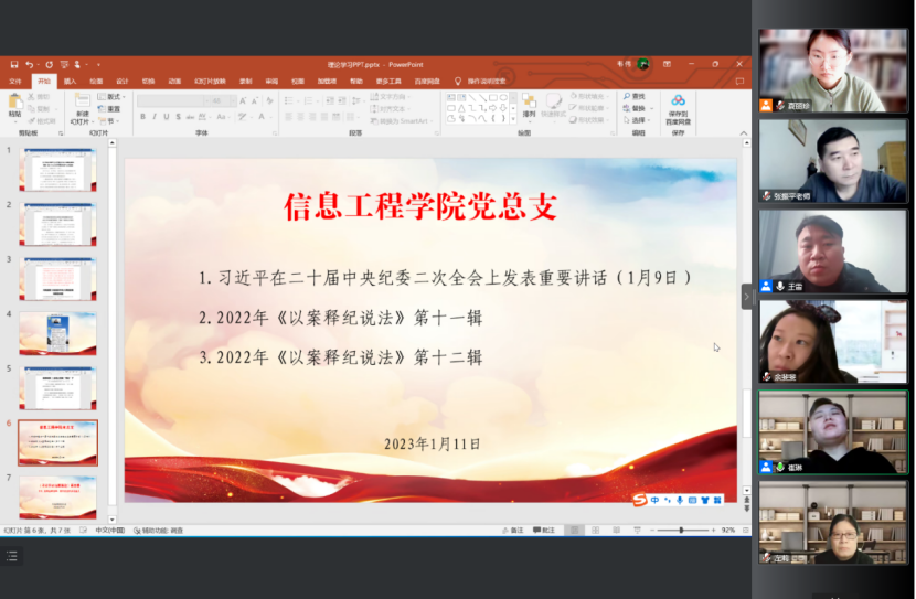 会议第二项,崔琳梳理总结2022年学院党建工作要点及廉政工作落实情况,传达并组织学习学校纪委近期下发的三个重要文件。会议中指出,按照《河南省纪委监委驻省教育厅纪检监察组关于2023年元旦春节期间纠”四风”树新风工作提示》及学校纪委《关于坚定不移严之又严落实中央八项规定精神 确保 2023 年元旦春节期间风清气正的通知》精神,信息工程学院党总支在2022年12月29日、31日组织全体教职工进行了相关文件学习,在2023年1月4日、6日分两次学习了违反中央八项规定典型案例、违反教师职业行为典型案例,并在1月5日采用新媒体形式进行了集体廉政提醒谈话。1月11日上午,组织全体教职工学习《习近平在二十届中央纪委二次全会上发表重要讲话》、2022年《以案释法》第十一辑、2022年《以案释法》第十二辑,崔琳书记再次强调元旦春节既是“人情关”,更是“廉洁关”,要求每一位教职工在元旦春节期间牢记校纪委通知精神,纠四风树新风,过一个廉洁祥和文明的假期。