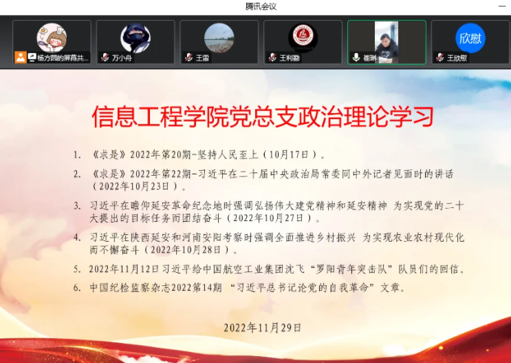 为进一步深入学习贯彻党的二十大精神,牢牢把握新时代新征程的使命任务,2022年11月29日下午,信息工程学院党总支组织东西校区全体党员及教职工,在开封北院A306及腾讯会议开展线上线下同步的政治理论学习活动,集中学习了:《求是》2022年第20期-坚持人民至上;《求是》2022年第22期-习近平在二十届中央政治局常委同中外记者见面时的讲话;习近平在瞻仰延安革命纪念地时强调弘扬伟大建党精神和延安精神 为实现党的二十大提出的目标任务而团结奋斗;习近平在陕西延安和河南安阳考察时强调全面推进乡村振兴 为实现农业农村现代化而不懈奋斗;2022年11月12日习近平给中国航空工业集团沈飞“罗阳青年突击队”队员们的回信;中国纪检监察杂志2022第14期 “习近平总书记论党的自我革命”文章。本次学习由信息工程学院党总支书记崔琳主持。
