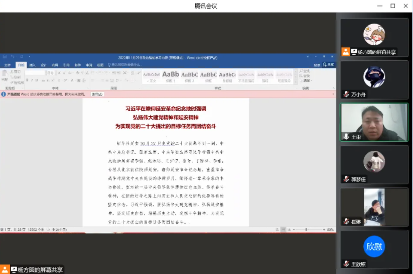 信息工程学院院长王雷带领全体教职工继续深入学习“习近平在瞻仰延安革命纪念地时强调弘扬伟大建党精神和延安精神为实现党的二十大提出的目标任务而团结奋斗”,王雷强调:全体党员教师要忆峥嵘岁月,在基层岗位上继续传承奋斗精神。继续深入学习老一辈革命家和老一代共产党人在延安时期形成和发扬的优良传统和作风,培育形成的以坚定正确的政治方向、解放思想实事求是的思想路线、全心全意为人民服务的根本宗旨、自力更生艰苦奋斗的创业精神为主要内容的延安精神。无论时代如何发展、环境如何变化,自力更生、艰苦奋斗始终是我们党战胜困难的传家宝,是实现民族复兴和推进国家现代化建设的强大动力。新时代继续弘扬延安精神,最重要的就是以之来滋养初心、淬炼灵魂,从中汲取信仰的力量、查找党性的差距、校准前进的方向。