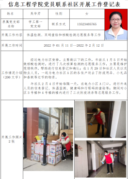 根据《中共河南应用技术职业学院委员会关于深化在职党员到村(社区)报到制度助力疫情群防群控工作的通知》(应院党字〔2022〕6号)文件要求,信息工程学院党总支积极对接社区,组织学院党员教师积极到社区(村)报到,充实群防群控力量。