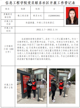 信息工程学院党总支全体党员积极落实到社区(村)报告,填写党员联系社区开展工作登记表,建立工作台账,将工作规范化,细致化。党员同志们有的在社区门口进行出入车辆登记,有的积极协助社区工作人员场所消毒,有的负责楼栋整体的防疫卫生把控,有的帮助社区人员进行资料整理,真正做到了多点开花,全面发力,把党员身份亮了出来,把能力体现到了实处。
