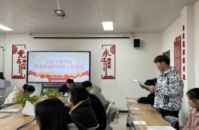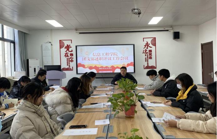为加强信息工程团支部的自身建设,落实本学年各班级团支书的工作情况,要求各班级团支书为自己本学年在团支部的工作做出简要述职报告。信息工程学院于2021年12月18日上午在党员活动室议室召开本学年第一次团支部述职评议工作会议。本次述职工作评议会议由团总支书记赵源老师召开,其中20级、21级各班团支书分别进行述职。