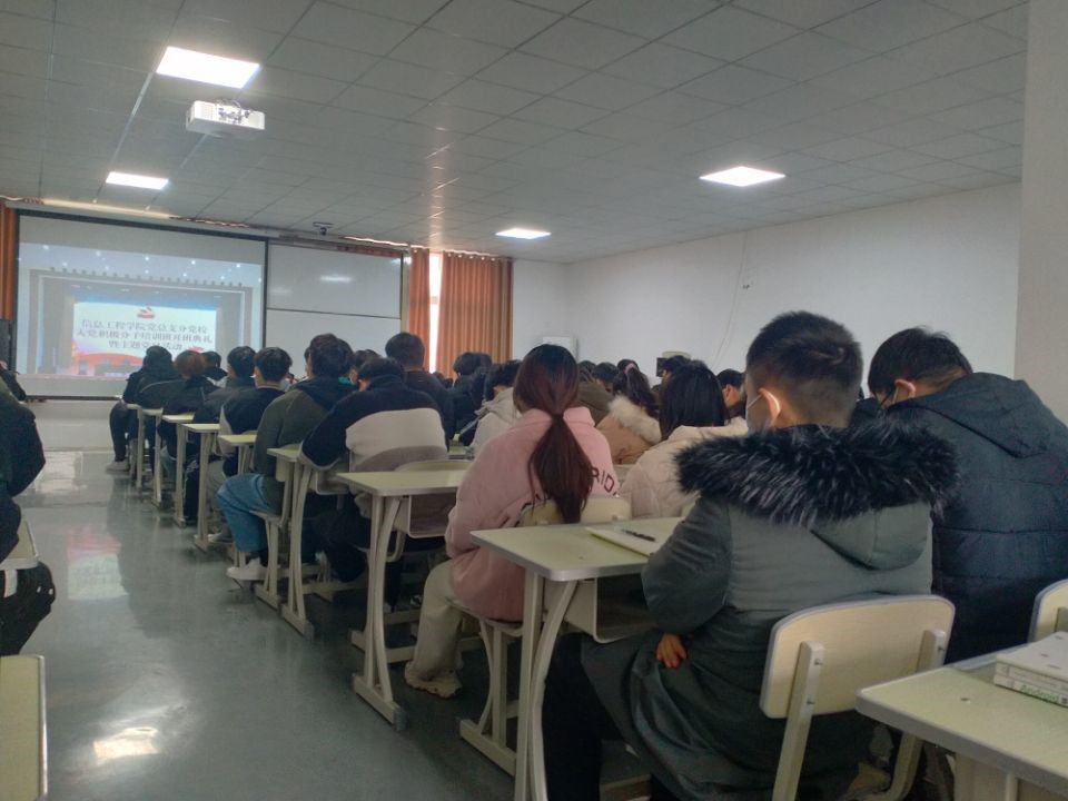为落实好党员发展培训工作,深入推进党史学习教育,帮助入党积极分子进一步掌握党的知识,端正入党动机,进一步提高党员素质。2021年12月8日上午12点45分,信息工程学院东、西校区开展党总支分党校入党积极分子培训班开班典礼暨主题党日活动。信息工程学院党总支书记楚斌同志、副院长崔琳同志、党总支宣传委员张振平同志、党总支纪检委员夏丽珍同志、团总支书记赵源同志及东、西校区20级256名入党积极分子参加开班典礼。