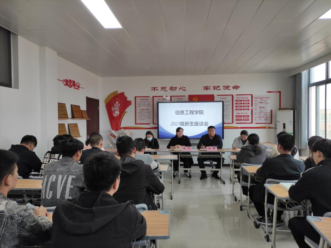 为了进一步深化党史学习教育,扎实推进我为群众办实事活动向纵深开展,2021年11月04日下午16:00,信息工程学院在行政楼A512召开学院21级新生座谈会。41位学生代表参加了座谈会,信息工程学院院长王雷、副院长崔琳及教学办公室成员出席本次会议。