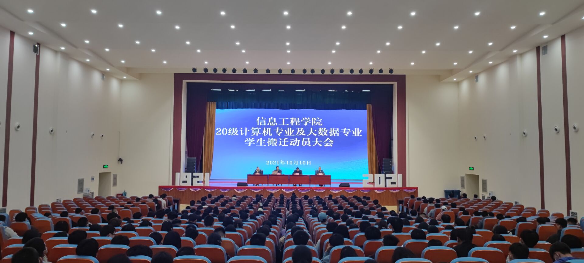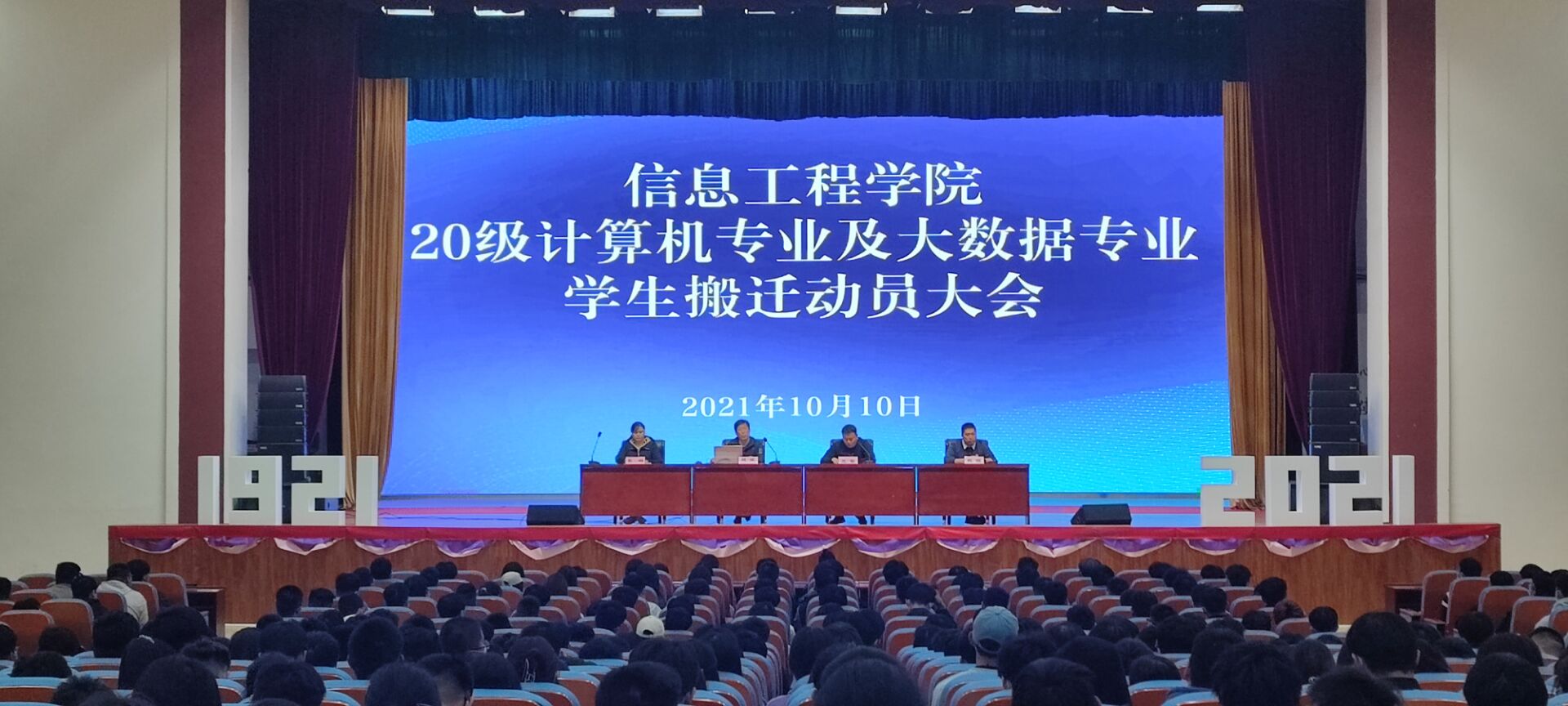 2021年10月10日下午5:30,信息工程学院召开20级计算机应用技术专业和大数据技术专业东校区搬迁动员会。全体学院领导出席会议,党总支书记楚斌主持,学院相关专业学生和本部们教师代表和辅导员400余人参加会议。