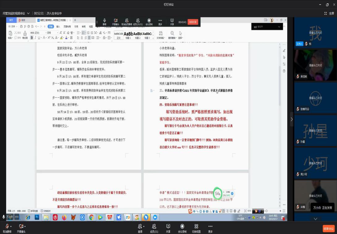 随后,资助专员万小舟老师向大家详细解读了《河南应用技术职业学院关于做好2021年国家奖助学金评审工作的通知》,《2021年度国家助学贷款工作有关问题的通知》,《2020—2021学年评先评优的通知》,《2021年贫困生认定工作通知》,《信息工程学院2021年资助工作流程》,《辅导员审核资助系统流程》,《资助系统填写教程》以及各项表格的填写等文件的内容和要求,并就往年学院在学生资助工作中一些好的经验做法,以及容易出现的部分细节问题与大家进行了交流。