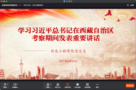 为认真贯彻学习习近平总书记在西藏考察时的重要讲话精神,2021年8月24日晚七点半,信息工程学院党总支组织全体党员通过钉钉会议平台进行网上集中学习。会议由信息工程学院党总支书记楚斌主持。