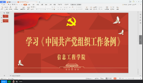为确保党中央关于组织工作的重大决策部署落到实处,根据校党委工作安排,2021年8月14日晚八点,信息工程学院党总支组织全体教师通过钉钉会议平台集中学习《中国共产党组织工作条例》。会议由信息工程学院党总支书记楚斌主持。