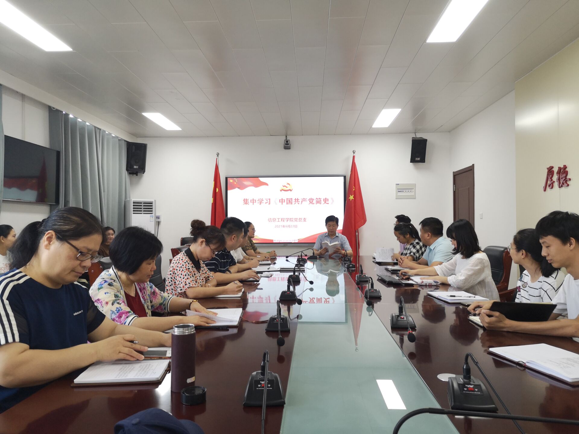 为深入贯彻落实学校政治学习任务,稳步推进我院教职工的党史学习教育,2021年6月22日下午,信息工程学院党总支组织全体专兼职教师,分别于西校区A315和东校区519机房进行学习活动。西校区会议由信息工程学院党总支书记楚斌主持,东校区会议由学工办主任闫莹主持。