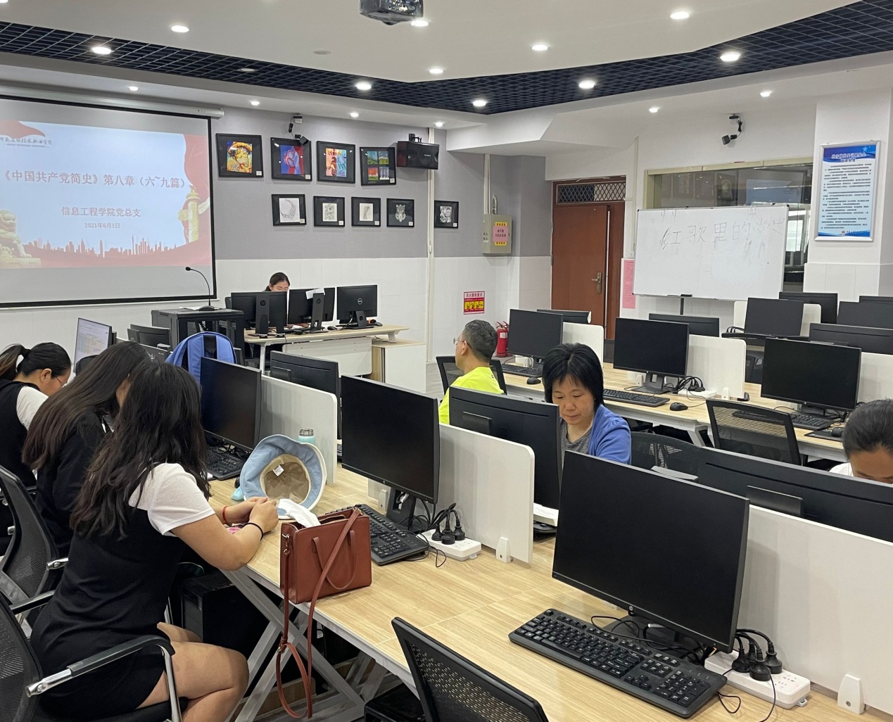 为深入贯彻落实学校政治学习任务,稳步推进我院教职工的党史学习教育,2021年6月1日下午,信息工程学院党总支组织全体专兼职教师,辅导员等,分别于西校区E414机房和东校区519机房进行学习活动。西校区会议由信息工程学院党总支纪检委员夏丽珍主持,东校区会议由办公室主任常昆主持。