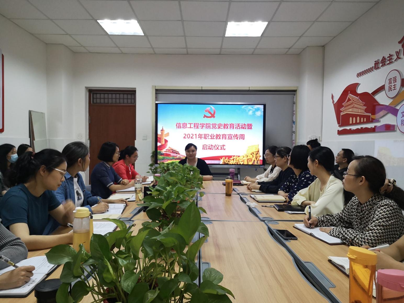 为大力弘扬劳动光荣、技能宝贵、创造伟大的时代风尚,5月21日下午,信息工程学院职业教育活动周启动仪式在实训楼E315党员活动室举行,院部领导及专兼职教师参加了本次会议。会议由王雷院长主持,他对2020年信息工程学院师生取得的建设成果进行了总结和剖析,从专业建设、教师培养、学生发展、校企合作、技能大赛等方面总结了师生所取得的成绩,并表态2021年将继续积极支持师生开拓创新,坚持立德树人,把思政教育融入育人全过程,弘扬工匠精神,加强“双师型”教师队伍建设,提升专业群建设质量,打造信息技术职教品牌。党总支书记楚斌同志对本次活动的开展发言表态:当前正处于发展黄金期,加快发展现代职业教育是党中央、国务院作出的重大战略部署。职业教育活动周就是展示、宣传和推动职业教育发展的一项重要制度设计。职业活动周通过开展劳动和职业启蒙教育、职业体验、成果展示、校园文化展示等活动,让更多人感受到现代职业教育的特色与魅力。通过举办技能竞赛等活动,向社会展示广大职校学生专业技能和职业素养;开展“职业教育宣传周”活动,大力宣传党和国家职业教育方针政策。通过这一系列活动的开展,让社会更多地认识职教、关心职教、支持职教、发展职教、共享职教,积极推动形成“人人出彩,技能强国”的良好氛围。