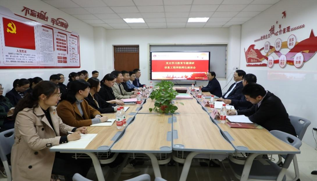 4月14日下午,九游体育党委书记闫俊山、党委副书记蒋清民、党委委员常新中在学校相关职能部门负责人的陪同下,来到E315信息工程学院党员活动室,召开“党史学习教育”专题调研座谈会。会议由信息工程学院院长王雷主持,信息工程学院部分师生代表参加会议。
