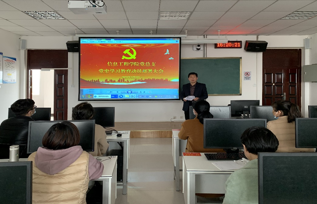 为深入学习贯彻习近平总书记在党史学习教育动员大会上的重要讲话精神,及落实校党委《党史学习教育的实施方案》要求,2021年4月1日下午,信息工程学院党总支全体党员分别在西校区E315和东校区519机房召开了党史学习教育动员部署会议,并开展学习《中国共产党简史》第一章中国共产党的创建和投身大革命的洪流,本次会议由信息工程学院党总支组织委员张振平同志主持。东校区由党总支书记楚斌同志主持。
