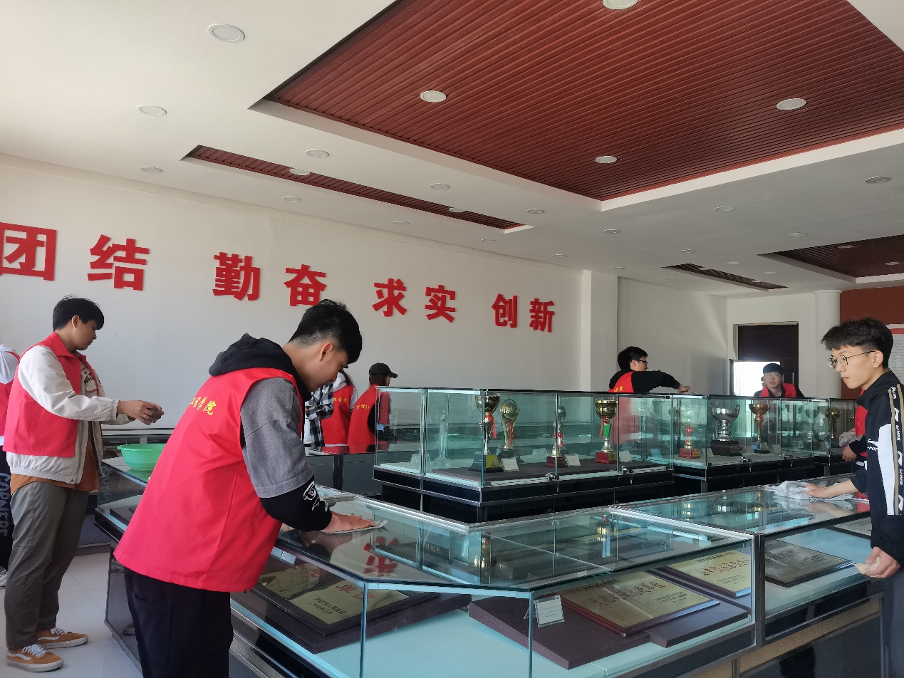 本次志愿者队伍由信息工程学院团学会干部及入党积极分子组成,他们准时到达校史馆现场,有序进行卫生打扫,分工明确,相互协助,充分的发挥了先锋模范带头作用。