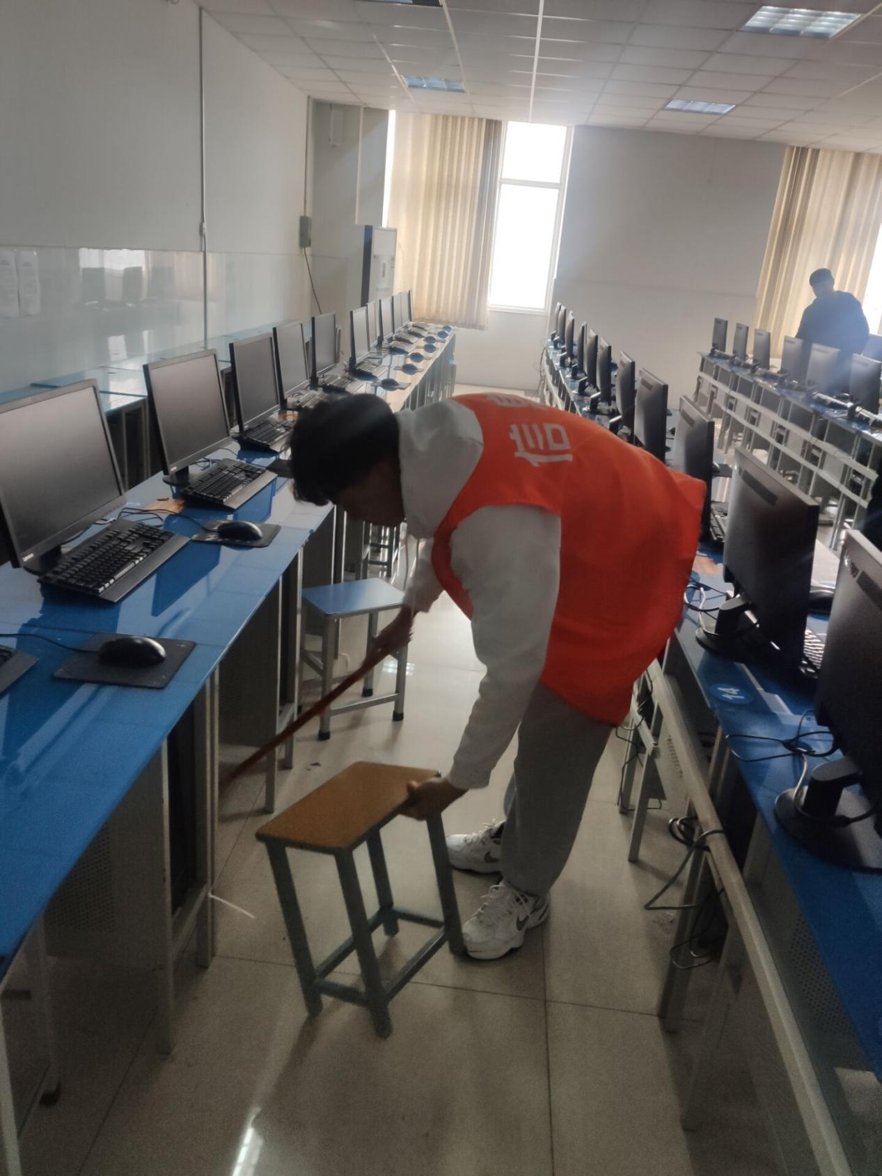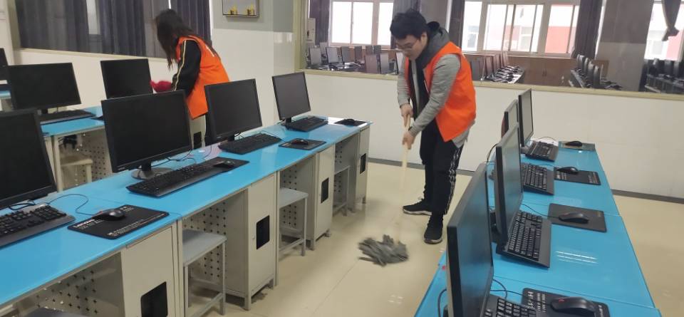 通过实训室卫生打扫把劳动观念渗透到育人的每一个环节,让同学们养成劳动习惯,形成劳动意识的同时也珍惜他人的劳动成果,志愿者们在打扫时毫不马虎,干劲十足,不落下任何一个角落。他们将电脑桌面清洁干净,室内地面打扫干净,实训电脑放置整齐,有效地为实训室环境清洁贡献出了自己的一份力量。
