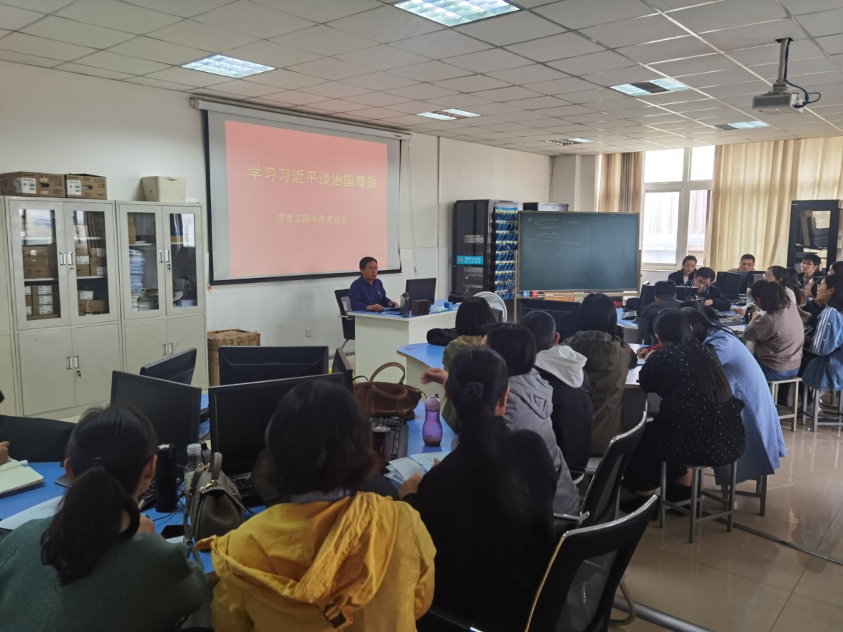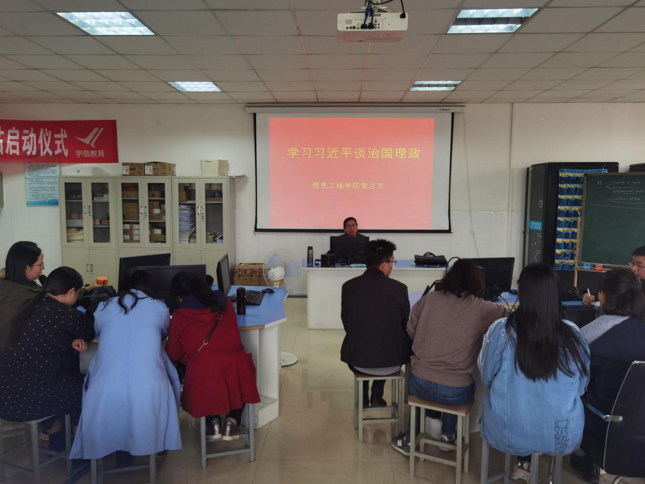 为深入学习领会习近平新时代中国特色社会主义思想,2020年10月6日下午,信息工程学院党总支分别在东西校区召开专题会议,开展以学习《习近平谈治国理政》第三卷专题四、专题八和专题十为主要内容的主题党日活动,信息工程学院党总支书记楚斌同志及副书记杨明杰同志分别主持了会议并对有关内容进行了解读,主要内容如下: