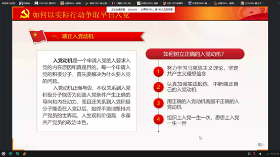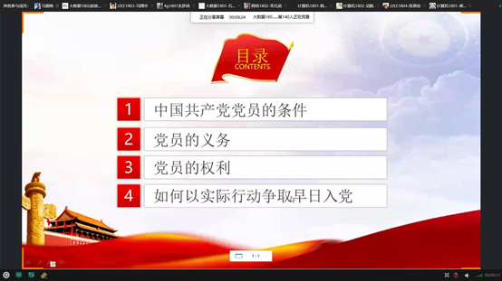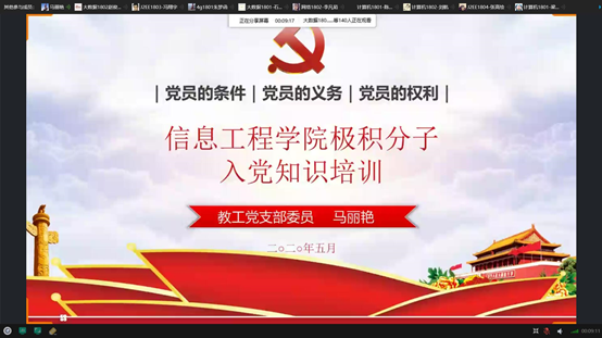 为进一步提高入党积极分子的政治理论水平,加强党员发展工作的质量。2020年5月21日晚,信息工程学院教工支部组织委员马丽艳老师通过QQ群屏幕共享为153名入党积极分子讲述了党课培训第七讲《党员的条件、义务和权利》。